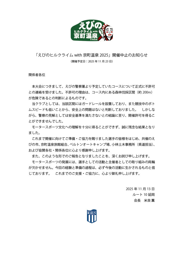 当クラブは「えびのヒルクライムwith京町温泉2025」の開催予定ではありましたが、中止となりました。たくさんの方々からのご支援・応援を頂きながらの今回の決断に至りました事を深くお詫び申し上げます。詳細は下記の~重要なお知らせ~をご覧ください。